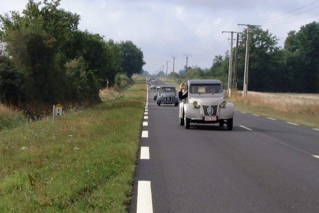 La première reprend l’un des parcours définis par les ingénieurs avant-guerre. D’après l’itinéraire imposé, les essayeurs effectuaient, de nuit en dehors du centre d¹essais secret, divers tests d’endurance et de comportement routier. Ce sont donc pas moins de treize 2 CV A et de deux 2 CV AU de 1952, emmenées par une Traction 11 BL, qui s’élancent à la découverte des environs de La Ferté-Vidame. Elles empruntant dans un premier temps la fameuse ligne droite de 15 kilomètres qui mène directement à Verneuil-sur-Avre. Au gré de la traversée des villages, des forêts et de la campagne environnante, les participants suivent le trajet des essayeurs d’autrefois sur des petites routes départementales aux reliefs si variés.