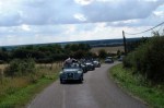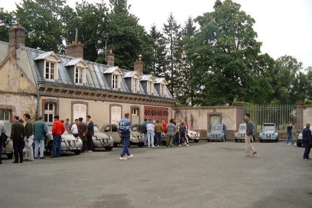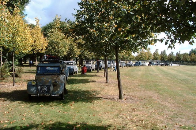 Si quelques 2 CV conservent encore leur premier numéro d’immatriculation, des propriétaires scrupuleux poussent le soucis du détail jusqu’à reproduire, pour l’occasion, l’immatriculation originale perdue au fil des mutations géographique. Aussi, sans se donner le mot, un nombre non négligeable de participants a pris l’heureuse initiative de se vêtir en habits d’époque, bérets y compris. Après un pique-nique pris sous les arbres au bord des étangs de Mousseuse étang avec vue sur les saisissantes ruines du château et un imposant alignement de 2 CV à moteur de 375 cm3, le cortège reprend la route pour la seconde balade, celle du Tour des Murs, qui se révèle tout aussi émouvante que celle du matin. Le tour des 850 hectares entièrement clos de murs gris et muets agite encore bien des imaginations.