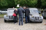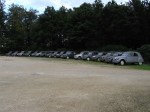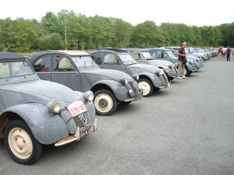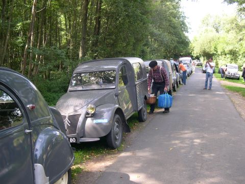Si quelques 2 CV conservent encore leur premier numéro d’immatriculation, des propriétaires scrupuleux poussent le soucis du détail jusqu’à reproduire, pour l’occasion, l’immatriculation originale perdue au fil des mutations géographique. Aussi, sans se donner le mot, un nombre non négligeable de participants a pris l’heureuse initiative de se vêtir en habits d’époque, bérets y compris. Après un pique-nique pris sous les arbres au bord des étangs de Mousseuse étang avec vue sur les saisissantes ruines du château et un imposant alignement de 2 CV à moteur de 375 cm3, le cortège reprend la route pour la seconde balade, celle du Tour des Murs, qui se révèle tout aussi émouvante que celle du matin. Le tour des 850 hectares entièrement clos de murs gris et muets agite encore bien des imaginations.