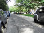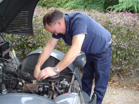 Comme c’est désormais devenu une habitude, les discussions sont allées bon train autour de divers sujets tels qu’un problème technique, une astuce pour remplacer une pièce de venue introuvable, une pièce sortie du coffre, un réglage à peaufiner, une teinte de carrosserie voire une panne. En effet, la voiture de Jean-Michel, pourtant venue par la route la veille en effectuant 260 kilomètres, a soudainement fait des caprices. L’alimentation en carburant était en cause, mais il a fallu s’y reprendre à plusieurs reprises pour finalement découvrir que c’est un pointeau encrassé qui était à l’origine de la panne… D’où l’intérêt de monter au moins un filtre à essence avant le carburateur ! La matinée s’est achevée sur la place Henri Prat par un apéritif pris sur les capots avant de rejoindre, comme les années précédentes, les bassins de Mousseuse pour y pique-niquer. Là, pendant que leurs équipages reprenaient des forces, les voitures se sont retrouvées alignées au bord de la route, à l’ombre des arbres qui bordent les deux étangs pour le plus grand plaisir des automobilistes et des passants.