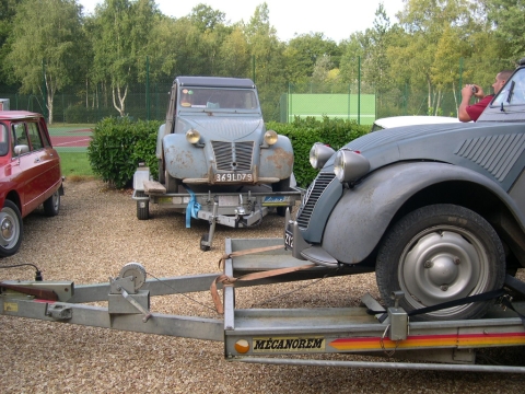 Les samedi 2 et dimanche 3 septembre 2000, une poignée de passionnée de 2 CV à moteur de 375 cm3 s’est donc retrouvée à La Ferté-Vidame pour passer deux jours de passion pure sur les routes qui ont vu la 2 CV effectuer ses premiers tours de roue dès la fin des années trente. Car le parcours repris pour la première balade du samedi matin n’est autre que le parcours défini par les ingénieurs de Citroën et que les essayeurs effectuaient de nuit en sortant discrètement du centre d’essais voisin. Ce parcours a d’ailleurs été communiqué aux organisateurs par Pierre Terrasson qui, à l’époque, l’a fait à maintes reprises au volant de prototypes à moteur refroidis par eau et ne comportant qu’un seul phare. En tout, pas moins de huit 2 CV A sont au départ sur la place Saint-Simon. Certaines sont arrivées sur une remorque porte-voiture mais d’autres n’ont pas hésité à venir par la route depuis Périgueu