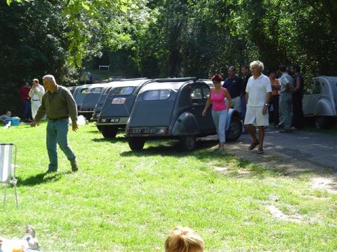 Officiellement, cette manifestation débute le samedi matin dès neuf heures, mais, cette année, bon nombre de ses participants se sont donné rendez-vous dès le vendredi en début d’après-midi au camping municipal de La Ferté-Vidame. Cela leur a en effet permis de prendre le temps de s’installer, de planter la tente, d’effectuer les derniers préparatifs de leurs voitures mais aussi de savourer ces instants de retrouvailles et d’accueillir les nouveau venus. Puis la soirée s’est organisée dans une ambiance des plus conviviales autour de quelques verres de l’amitié et d’un barbecue initié par Philippe. Une fois la nuit tombée, les réjouissances ont été momentanément interrompues et les 2 CV présentes ont quitté le camping en convoi pour une reconnaissance de « la petiote balade au clair de lune » prévue pour le lendemain soir. Malheureusement, certains équipages se sont égayés dans la nature avant la fin du parcours. De retour au camping, les retrouvailles et les grillades se sont poursuivies assez tard dans la nuit tant et si bien que lorsque tout le monde est allé se coucher, pas moins de 14 voitures sur les 18 inscrites étaient déjà sur place. Cette année, la rencontre annuelle du club Les Filles de Levallois a fait l’objet de petites améliorations. Ainsi, le rendez-vous du samedi matin n’est plus fixé à La Ferté-Vidame même, sur la place Saint Simon, mais sur la place Henri Prat qui se trouve sur le territoire de la commune mitoyenne de Lamblore. Celle-ci offre en effet un espace plus adapté au rassemblement de 2 CV anciennes. Autre modification, les balades du samedi matin, la Balade de Culoiseau (comportant une côte de un kilomètre à dix pour cent !) et la Balade des Essayeurs ne se faisaient plus en convoi, mais individuellement, en suivant les indications du livret de route remis à chaque équipage participant. Chacun restant donc maître de son emploi du temps, et la place Henri Prat servant ainsi de « camp de base » pour toute la matinée. Il est vrai que les deux parcours proposés sont tous les deux longs d’une quarantaine de kilomètres et qu’en 2 CV A ou en 2 CV AU, il faut bien une matinée complète pour en venir à bout !